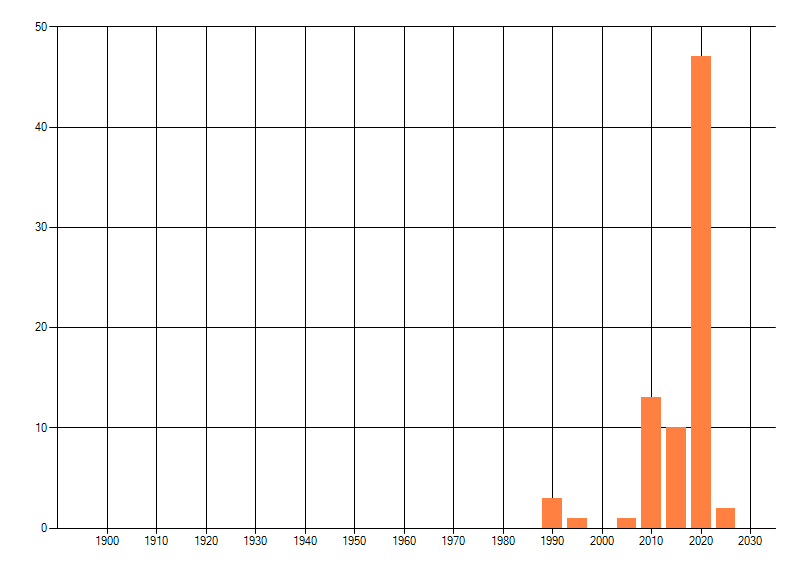 Het aantal atlasblokken (5x5 km) waarin de soort is gemeld binnen een periode van vijf jaar (vanaf 1980) of twintig jaar. Niet gecorrigeerd voor waarnemersinspanning en het aantal doorgegeven waarnemingen kan sterk variëren per periode, dus een trend in verspreiding kan hier niet direct uit worden afgelezen. Het opgegeven jaartal is het eerste jaar van de periode. Bron: gevalideerde waarnemingen uit de NDFF.