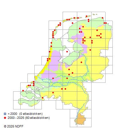 Het aantal atlasblokken (5x5 km) waarin de soort is gemeld binnen een periode van vijf jaar (vanaf 1980) of twintig jaar. Niet gecorrigeerd voor waarnemersinspanning en het aantal doorgegeven waarnemingen kan sterk variëren per periode, dus een trend in verspreiding kan hier niet direct uit worden afgelezen. Het opgegeven jaartal is het eerste jaar van de periode. Bron: gevalideerde waarnemingen uit de NDFF.