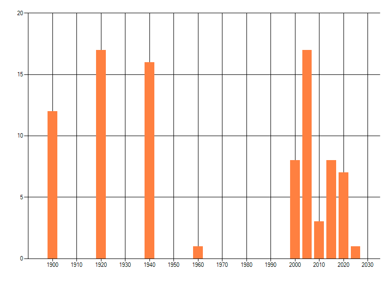 Het aantal atlasblokken (5x5 km) waarin de soort is gemeld binnen een periode van vijf jaar (vanaf 1980) of twintig jaar. Niet gecorrigeerd voor waarnemersinspanning en het aantal doorgegeven waarnemingen kan sterk variëren per periode, dus een trend in verspreiding kan hier niet direct uit worden afgelezen. Het opgegeven jaartal is het eerste jaar van de periode. Bron: gevalideerde waarnemingen uit de NDFF.