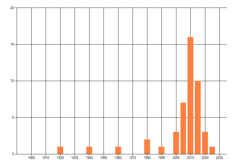 Het aantal atlasblokken (5x5 km) waarin de soort is gemeld binnen een periode van vijf jaar (vanaf 1980) of twintig jaar. Niet gecorrigeerd voor waarnemersinspanning en het aantal doorgegeven waarnemingen kan sterk variëren per periode, dus een trend in verspreiding kan hier niet direct uit worden afgelezen. Het opgegeven jaartal is het eerste jaar van de periode. Bron: gevalideerde waarnemingen uit de NDFF.