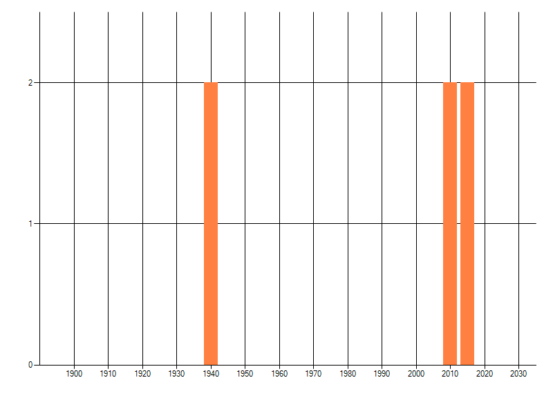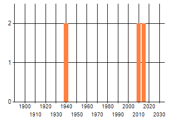 Het aantal atlasblokken (5x5 km) waarin de soort is gemeld binnen een periode van vijf jaar (vanaf 1980) of twintig jaar. Niet gecorrigeerd voor waarnemersinspanning en het aantal doorgegeven waarnemingen kan sterk variëren per periode, dus een trend in verspreiding kan hier niet direct uit worden afgelezen. Het opgegeven jaartal is het eerste jaar van de periode. Bron: gevalideerde waarnemingen uit de NDFF.