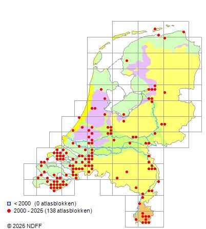Het aantal atlasblokken (5x5 km) waarin de soort is gemeld binnen een periode van vijf jaar (vanaf 1980) of twintig jaar. Niet gecorrigeerd voor waarnemersinspanning en het aantal doorgegeven waarnemingen kan sterk variëren per periode, dus een trend in verspreiding kan hier niet direct uit worden afgelezen. Het opgegeven jaartal is het eerste jaar van de periode. Bron: gevalideerde waarnemingen uit de NDFF.