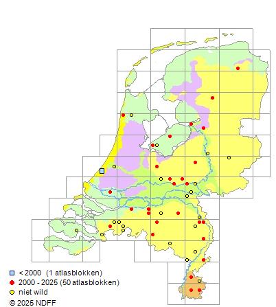Het aantal atlasblokken (5x5 km) waarin de soort is gemeld binnen een periode van vijf jaar (vanaf 1980) of twintig jaar. Niet gecorrigeerd voor waarnemersinspanning en het aantal doorgegeven waarnemingen kan sterk variëren per periode, dus een trend in verspreiding kan hier niet direct uit worden afgelezen. Het opgegeven jaartal is het eerste jaar van de periode. Bron: gevalideerde waarnemingen uit de NDFF.