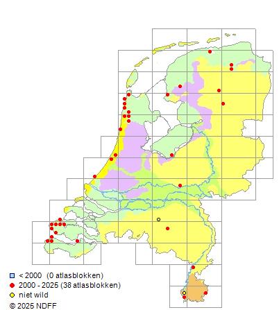 Het aantal atlasblokken (5x5 km) waarin de soort is gemeld binnen een periode van vijf jaar (vanaf 1980) of twintig jaar. Niet gecorrigeerd voor waarnemersinspanning en het aantal doorgegeven waarnemingen kan sterk variëren per periode, dus een trend in verspreiding kan hier niet direct uit worden afgelezen. Het opgegeven jaartal is het eerste jaar van de periode. Bron: gevalideerde waarnemingen uit de NDFF.