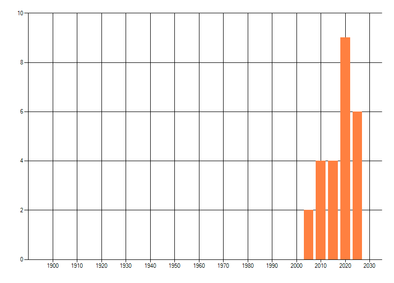 Het aantal atlasblokken (5x5 km) waarin de soort is gemeld binnen een periode van vijf jaar (vanaf 1980) of twintig jaar. Niet gecorrigeerd voor waarnemersinspanning en het aantal doorgegeven waarnemingen kan sterk variëren per periode, dus een trend in verspreiding kan hier niet direct uit worden afgelezen. Het opgegeven jaartal is het eerste jaar van de periode. Bron: gevalideerde waarnemingen uit de NDFF.