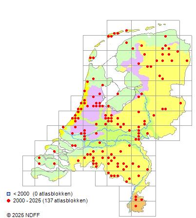 Het aantal atlasblokken (5x5 km) waarin de soort is gemeld binnen een periode van vijf jaar (vanaf 1980) of twintig jaar. Niet gecorrigeerd voor waarnemersinspanning en het aantal doorgegeven waarnemingen kan sterk variëren per periode, dus een trend in verspreiding kan hier niet direct uit worden afgelezen. Het opgegeven jaartal is het eerste jaar van de periode. Bron: gevalideerde waarnemingen uit de NDFF.