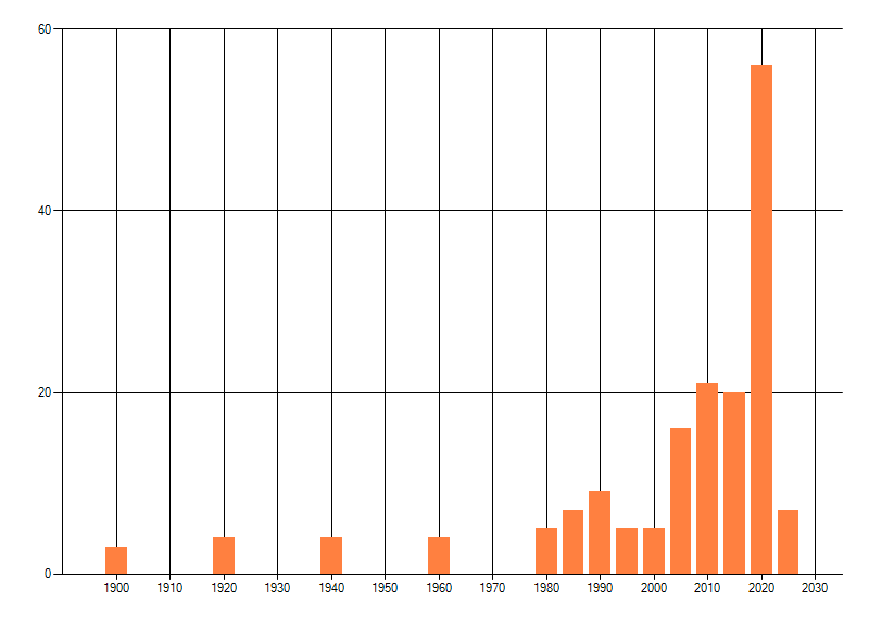Het aantal atlasblokken (5x5 km) waarin de soort is gemeld binnen een periode van vijf jaar (vanaf 1980) of twintig jaar. Niet gecorrigeerd voor waarnemersinspanning en het aantal doorgegeven waarnemingen kan sterk variëren per periode, dus een trend in verspreiding kan hier niet direct uit worden afgelezen. Het opgegeven jaartal is het eerste jaar van de periode. Bron: gevalideerde waarnemingen uit de NDFF.