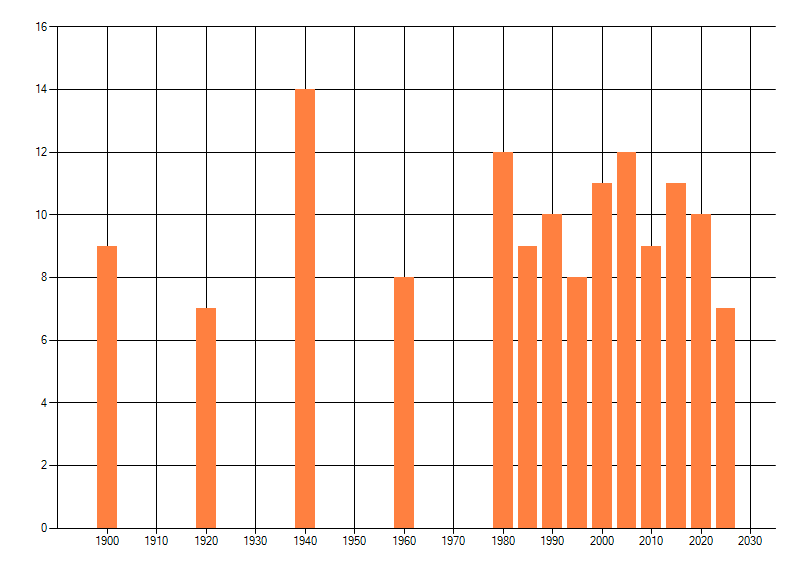 Het aantal atlasblokken (5x5 km) waarin de soort is gemeld binnen een periode van vijf jaar (vanaf 1980) of twintig jaar. Niet gecorrigeerd voor waarnemersinspanning en het aantal doorgegeven waarnemingen kan sterk variëren per periode, dus een trend in verspreiding kan hier niet direct uit worden afgelezen. Het opgegeven jaartal is het eerste jaar van de periode. Bron: gevalideerde waarnemingen uit de NDFF.