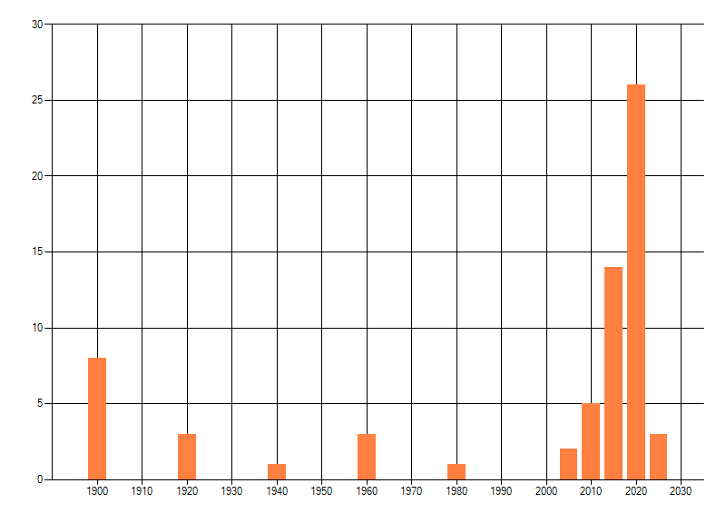 Het aantal atlasblokken (5x5 km) waarin de soort is gemeld binnen een periode van vijf jaar (vanaf 1980) of twintig jaar. Niet gecorrigeerd voor waarnemersinspanning en het aantal doorgegeven waarnemingen kan sterk variëren per periode, dus een trend in verspreiding kan hier niet direct uit worden afgelezen. Het opgegeven jaartal is het eerste jaar van de periode. Bron: gevalideerde waarnemingen uit de NDFF.