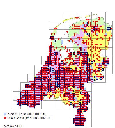 Het aantal atlasblokken (5x5 km) waarin de soort is gemeld binnen een periode van vijf jaar (vanaf 1980) of twintig jaar. Niet gecorrigeerd voor waarnemersinspanning en het aantal doorgegeven waarnemingen kan sterk variëren per periode, dus een trend in verspreiding kan hier niet direct uit worden afgelezen. Het opgegeven jaartal is het eerste jaar van de periode. Bron: gevalideerde waarnemingen uit de NDFF.