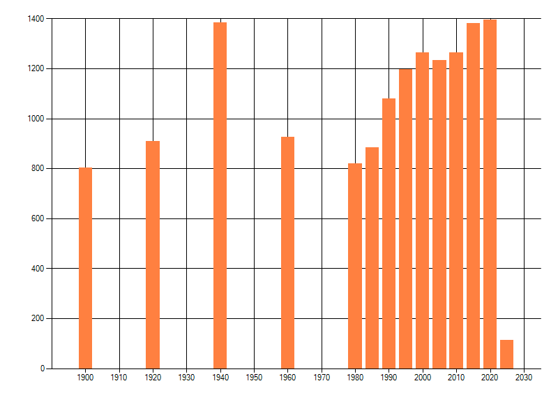Het aantal atlasblokken (5x5 km) waarin de soort is gemeld binnen een periode van vijf jaar (vanaf 1980) of twintig jaar. Niet gecorrigeerd voor waarnemersinspanning en het aantal doorgegeven waarnemingen kan sterk variëren per periode, dus een trend in verspreiding kan hier niet direct uit worden afgelezen. Het opgegeven jaartal is het eerste jaar van de periode. Bron: gevalideerde waarnemingen uit de NDFF.