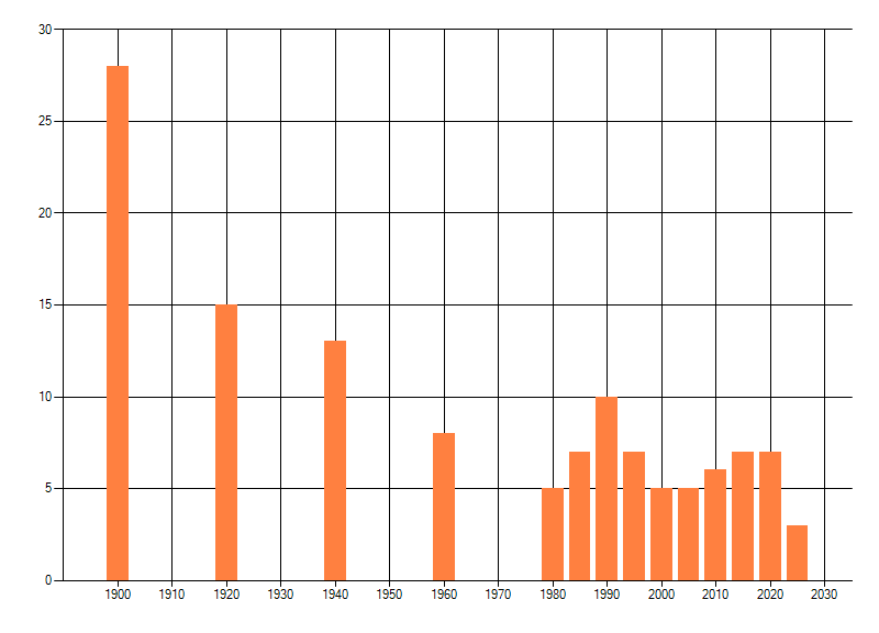 Het aantal atlasblokken (5x5 km) waarin de soort is gemeld binnen een periode van vijf jaar (vanaf 1980) of twintig jaar. Niet gecorrigeerd voor waarnemersinspanning en het aantal doorgegeven waarnemingen kan sterk variëren per periode, dus een trend in verspreiding kan hier niet direct uit worden afgelezen. Het opgegeven jaartal is het eerste jaar van de periode. Bron: gevalideerde waarnemingen uit de NDFF.