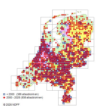 Het aantal atlasblokken (5x5 km) waarin de soort is gemeld binnen een periode van vijf jaar (vanaf 1980) of twintig jaar. Niet gecorrigeerd voor waarnemersinspanning en het aantal doorgegeven waarnemingen kan sterk variëren per periode, dus een trend in verspreiding kan hier niet direct uit worden afgelezen. Het opgegeven jaartal is het eerste jaar van de periode. Bron: gevalideerde waarnemingen uit de NDFF.