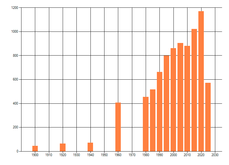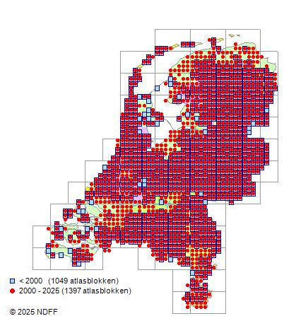 Het aantal atlasblokken (5x5 km) waarin de soort is gemeld binnen een periode van vijf jaar (vanaf 1980) of twintig jaar. Niet gecorrigeerd voor waarnemersinspanning en het aantal doorgegeven waarnemingen kan sterk variëren per periode, dus een trend in verspreiding kan hier niet direct uit worden afgelezen. Het opgegeven jaartal is het eerste jaar van de periode. Bron: gevalideerde waarnemingen uit de NDFF.