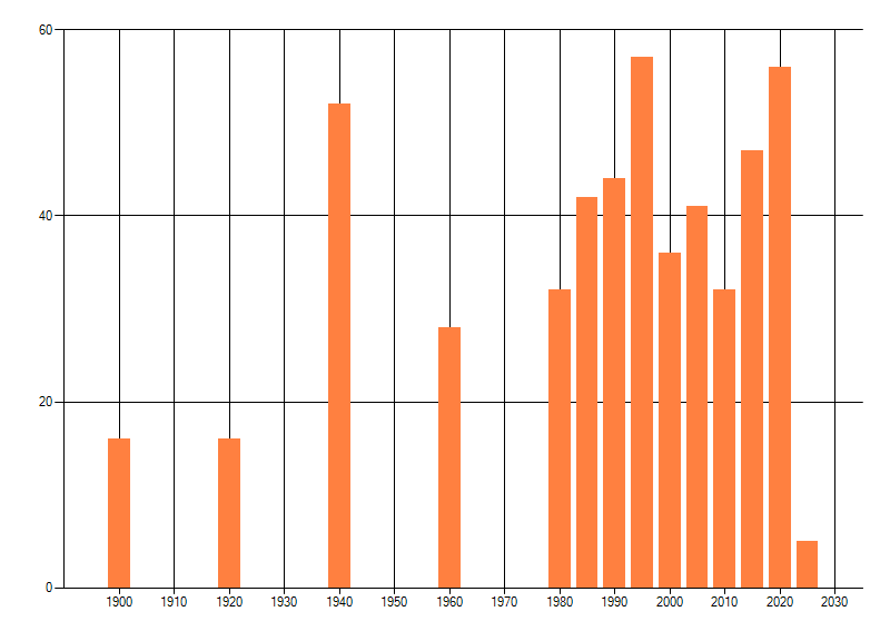 Het aantal atlasblokken (5x5 km) waarin de soort is gemeld binnen een periode van vijf jaar (vanaf 1980) of twintig jaar. Niet gecorrigeerd voor waarnemersinspanning en het aantal doorgegeven waarnemingen kan sterk variëren per periode, dus een trend in verspreiding kan hier niet direct uit worden afgelezen. Het opgegeven jaartal is het eerste jaar van de periode. Bron: gevalideerde waarnemingen uit de NDFF.