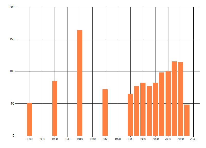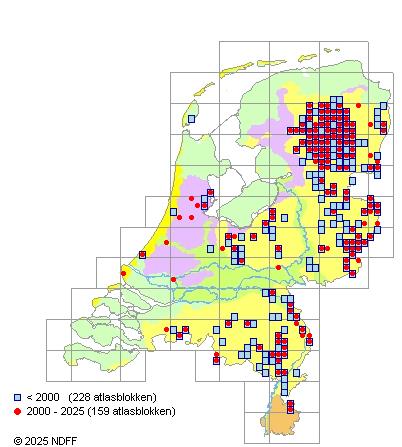 Het aantal atlasblokken (5x5 km) waarin de soort is gemeld binnen een periode van vijf jaar (vanaf 1980) of twintig jaar. Niet gecorrigeerd voor waarnemersinspanning en het aantal doorgegeven waarnemingen kan sterk variëren per periode, dus een trend in verspreiding kan hier niet direct uit worden afgelezen. Het opgegeven jaartal is het eerste jaar van de periode. Bron: gevalideerde waarnemingen uit de NDFF.