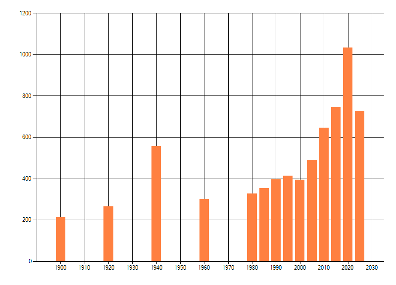 Het aantal atlasblokken (5x5 km) waarin de soort is gemeld binnen een periode van vijf jaar (vanaf 1980) of twintig jaar. Niet gecorrigeerd voor waarnemersinspanning en het aantal doorgegeven waarnemingen kan sterk variëren per periode, dus een trend in verspreiding kan hier niet direct uit worden afgelezen. Het opgegeven jaartal is het eerste jaar van de periode. Bron: gevalideerde waarnemingen uit de NDFF.