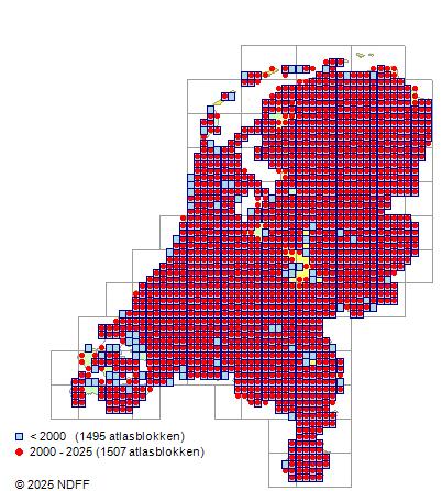 Het aantal atlasblokken (5x5 km) waarin de soort is gemeld binnen een periode van vijf jaar (vanaf 1980) of twintig jaar. Niet gecorrigeerd voor waarnemersinspanning en het aantal doorgegeven waarnemingen kan sterk variëren per periode, dus een trend in verspreiding kan hier niet direct uit worden afgelezen. Het opgegeven jaartal is het eerste jaar van de periode. Bron: gevalideerde waarnemingen uit de NDFF.