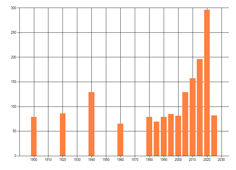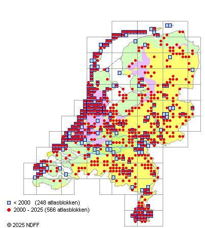 Het aantal atlasblokken (5x5 km) waarin de soort is gemeld binnen een periode van vijf jaar (vanaf 1980) of twintig jaar. Niet gecorrigeerd voor waarnemersinspanning en het aantal doorgegeven waarnemingen kan sterk variëren per periode, dus een trend in verspreiding kan hier niet direct uit worden afgelezen. Het opgegeven jaartal is het eerste jaar van de periode. Bron: gevalideerde waarnemingen uit de NDFF.