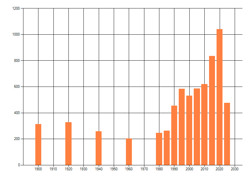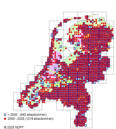 Het aantal atlasblokken (5x5 km) waarin de soort is gemeld binnen een periode van vijf jaar (vanaf 1980) of twintig jaar. Niet gecorrigeerd voor waarnemersinspanning en het aantal doorgegeven waarnemingen kan sterk variƫren per periode, dus een trend in verspreiding kan hier niet direct uit worden afgelezen. Het opgegeven jaartal is het eerste jaar van de periode. Bron: gevalideerde waarnemingen uit de NDFF.