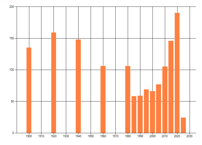 Het aantal atlasblokken (5x5 km) waarin de soort is gemeld binnen een periode van vijf jaar (vanaf 1980) of twintig jaar. Niet gecorrigeerd voor waarnemersinspanning en het aantal doorgegeven waarnemingen kan sterk variëren per periode, dus een trend in verspreiding kan hier niet direct uit worden afgelezen. Het opgegeven jaartal is het eerste jaar van de periode. Bron: gevalideerde waarnemingen uit de NDFF.