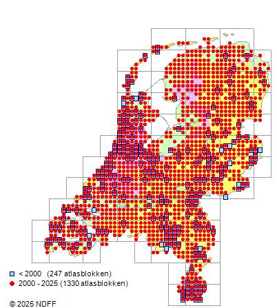 Het aantal atlasblokken (5x5 km) waarin de soort is gemeld binnen een periode van vijf jaar (vanaf 1980) of twintig jaar. Niet gecorrigeerd voor waarnemersinspanning en het aantal doorgegeven waarnemingen kan sterk variëren per periode, dus een trend in verspreiding kan hier niet direct uit worden afgelezen. Het opgegeven jaartal is het eerste jaar van de periode. Bron: gevalideerde waarnemingen uit de NDFF.