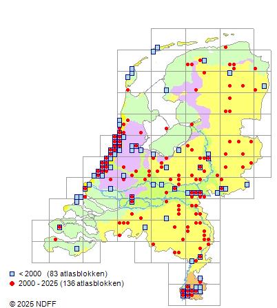 Het aantal atlasblokken (5x5 km) waarin de soort is gemeld binnen een periode van vijf jaar (vanaf 1980) of twintig jaar. Niet gecorrigeerd voor waarnemersinspanning en het aantal doorgegeven waarnemingen kan sterk variëren per periode, dus een trend in verspreiding kan hier niet direct uit worden afgelezen. Het opgegeven jaartal is het eerste jaar van de periode. Bron: gevalideerde waarnemingen uit de NDFF.