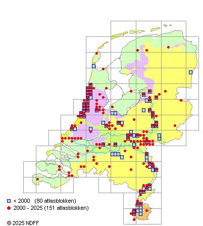 Het aantal atlasblokken (5x5 km) waarin de soort is gemeld binnen een periode van vijf jaar (vanaf 1980) of twintig jaar. Niet gecorrigeerd voor waarnemersinspanning en het aantal doorgegeven waarnemingen kan sterk variëren per periode, dus een trend in verspreiding kan hier niet direct uit worden afgelezen. Het opgegeven jaartal is het eerste jaar van de periode. Bron: gevalideerde waarnemingen uit de NDFF.
