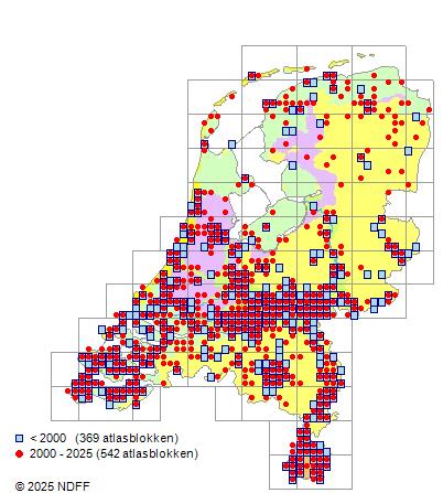 Het aantal atlasblokken (5x5 km) waarin de soort is gemeld binnen een periode van vijf jaar (vanaf 1980) of twintig jaar. Niet gecorrigeerd voor waarnemersinspanning en het aantal doorgegeven waarnemingen kan sterk variƫren per periode, dus een trend in verspreiding kan hier niet direct uit worden afgelezen. Het opgegeven jaartal is het eerste jaar van de periode. Bron: gevalideerde waarnemingen uit de NDFF.
