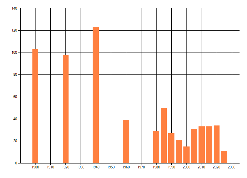 Het aantal atlasblokken (5x5 km) waarin de soort is gemeld binnen een periode van vijf jaar (vanaf 1980) of twintig jaar. Niet gecorrigeerd voor waarnemersinspanning en het aantal doorgegeven waarnemingen kan sterk variëren per periode, dus een trend in verspreiding kan hier niet direct uit worden afgelezen. Het opgegeven jaartal is het eerste jaar van de periode. Bron: gevalideerde waarnemingen uit de NDFF.
