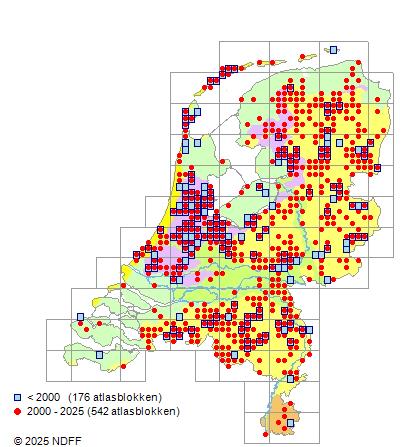 Het aantal atlasblokken (5x5 km) waarin de soort is gemeld binnen een periode van vijf jaar (vanaf 1980) of twintig jaar. Niet gecorrigeerd voor waarnemersinspanning en het aantal doorgegeven waarnemingen kan sterk variëren per periode, dus een trend in verspreiding kan hier niet direct uit worden afgelezen. Het opgegeven jaartal is het eerste jaar van de periode. Bron: gevalideerde waarnemingen uit de NDFF.