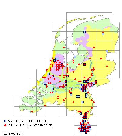 Het aantal atlasblokken (5x5 km) waarin de soort is gemeld binnen een periode van vijf jaar (vanaf 1980) of twintig jaar. Niet gecorrigeerd voor waarnemersinspanning en het aantal doorgegeven waarnemingen kan sterk variëren per periode, dus een trend in verspreiding kan hier niet direct uit worden afgelezen. Het opgegeven jaartal is het eerste jaar van de periode. Bron: gevalideerde waarnemingen uit de NDFF.