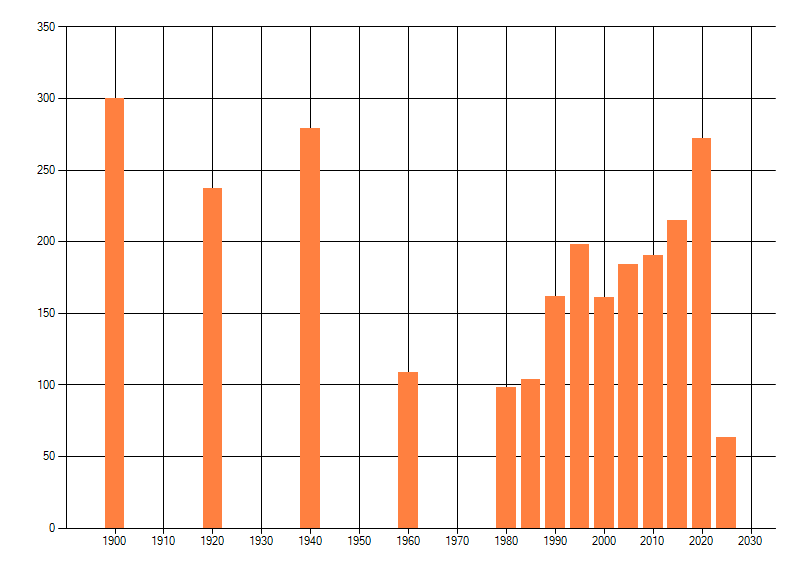 Het aantal atlasblokken (5x5 km) waarin de soort is gemeld binnen een periode van vijf jaar (vanaf 1980) of twintig jaar. Niet gecorrigeerd voor waarnemersinspanning en het aantal doorgegeven waarnemingen kan sterk variëren per periode, dus een trend in verspreiding kan hier niet direct uit worden afgelezen. Het opgegeven jaartal is het eerste jaar van de periode. Bron: gevalideerde waarnemingen uit de NDFF.