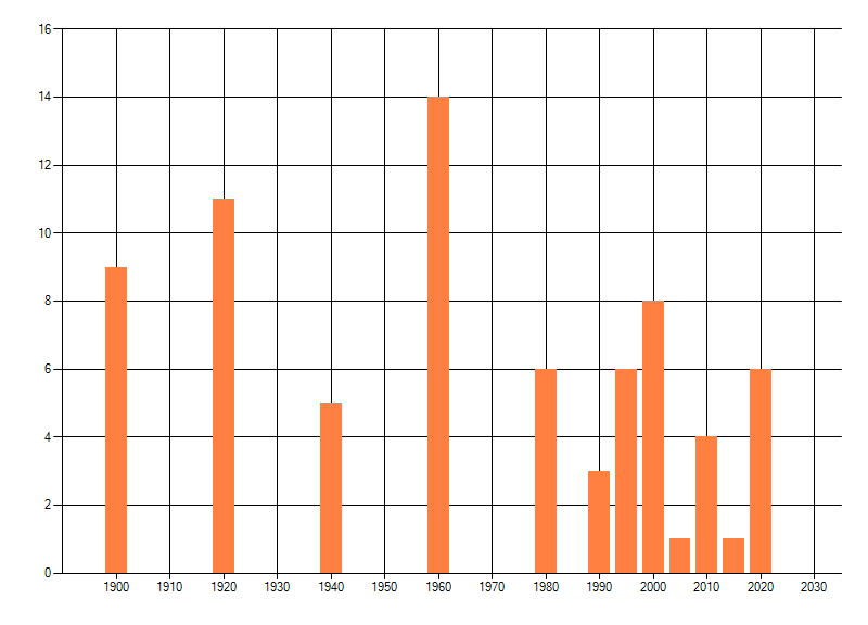 Het aantal atlasblokken (5x5 km) waarin de soort is gemeld binnen een periode van vijf jaar (vanaf 1980) of twintig jaar. Niet gecorrigeerd voor waarnemersinspanning en het aantal doorgegeven waarnemingen kan sterk variëren per periode, dus een trend in verspreiding kan hier niet direct uit worden afgelezen. Het opgegeven jaartal is het eerste jaar van de periode. Bron: gevalideerde waarnemingen uit de NDFF.