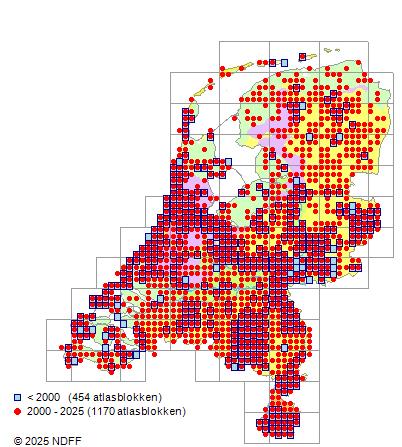 Het aantal atlasblokken (5x5 km) waarin de soort is gemeld binnen een periode van vijf jaar (vanaf 1980) of twintig jaar. Niet gecorrigeerd voor waarnemersinspanning en het aantal doorgegeven waarnemingen kan sterk variëren per periode, dus een trend in verspreiding kan hier niet direct uit worden afgelezen. Het opgegeven jaartal is het eerste jaar van de periode. Bron: gevalideerde waarnemingen uit de NDFF.