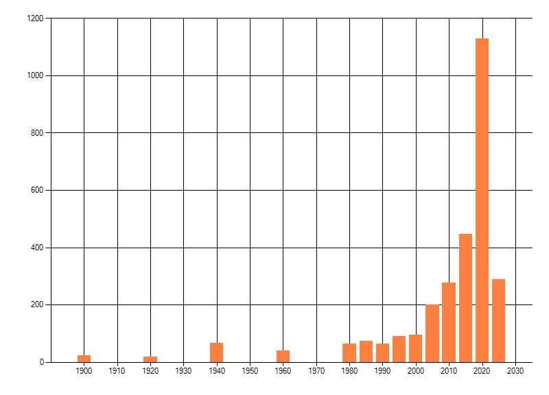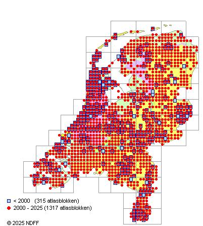 Het aantal atlasblokken (5x5 km) waarin de soort is gemeld binnen een periode van vijf jaar (vanaf 1980) of twintig jaar. Niet gecorrigeerd voor waarnemersinspanning en het aantal doorgegeven waarnemingen kan sterk variëren per periode, dus een trend in verspreiding kan hier niet direct uit worden afgelezen. Het opgegeven jaartal is het eerste jaar van de periode. Bron: gevalideerde waarnemingen uit de NDFF.