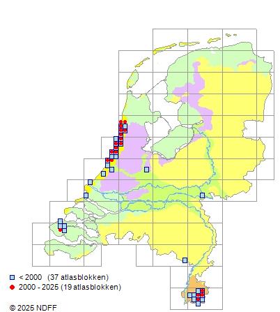Het aantal atlasblokken (5x5 km) waarin de soort is gemeld binnen een periode van vijf jaar (vanaf 1980) of twintig jaar. Niet gecorrigeerd voor waarnemersinspanning en het aantal doorgegeven waarnemingen kan sterk variëren per periode, dus een trend in verspreiding kan hier niet direct uit worden afgelezen. Het opgegeven jaartal is het eerste jaar van de periode. Bron: gevalideerde waarnemingen uit de NDFF.