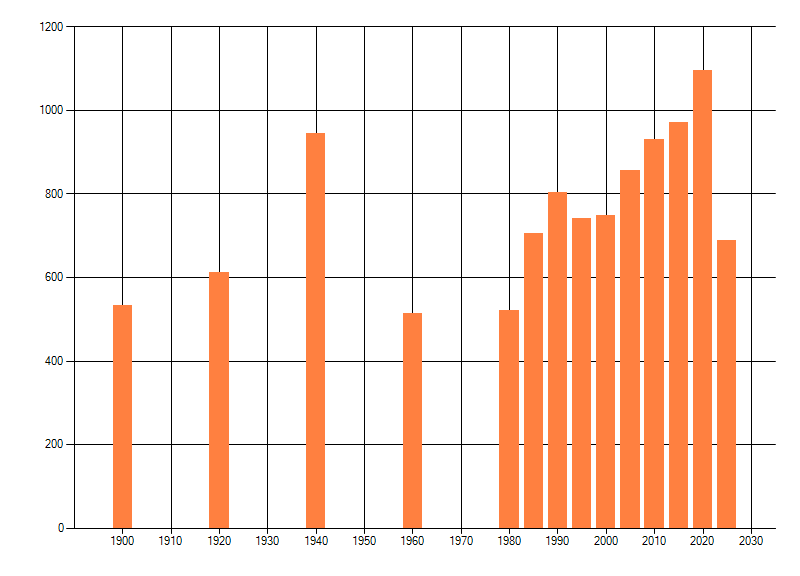 Het aantal atlasblokken (5x5 km) waarin de soort is gemeld binnen een periode van vijf jaar (vanaf 1980) of twintig jaar. Niet gecorrigeerd voor waarnemersinspanning en het aantal doorgegeven waarnemingen kan sterk variëren per periode, dus een trend in verspreiding kan hier niet direct uit worden afgelezen. Het opgegeven jaartal is het eerste jaar van de periode. Bron: gevalideerde waarnemingen uit de NDFF.