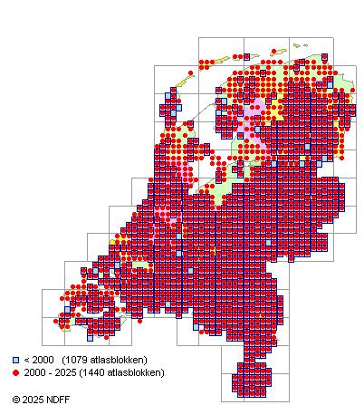 Het aantal atlasblokken (5x5 km) waarin de soort is gemeld binnen een periode van vijf jaar (vanaf 1980) of twintig jaar. Niet gecorrigeerd voor waarnemersinspanning en het aantal doorgegeven waarnemingen kan sterk variëren per periode, dus een trend in verspreiding kan hier niet direct uit worden afgelezen. Het opgegeven jaartal is het eerste jaar van de periode. Bron: gevalideerde waarnemingen uit de NDFF.