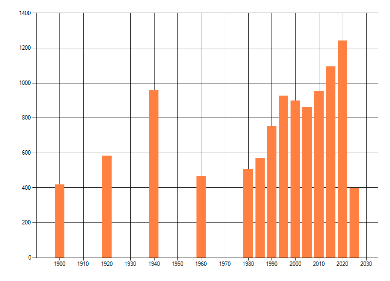 Het aantal atlasblokken (5x5 km) waarin de soort is gemeld binnen een periode van vijf jaar (vanaf 1980) of twintig jaar. Niet gecorrigeerd voor waarnemersinspanning en het aantal doorgegeven waarnemingen kan sterk variëren per periode, dus een trend in verspreiding kan hier niet direct uit worden afgelezen. Het opgegeven jaartal is het eerste jaar van de periode. Bron: gevalideerde waarnemingen uit de NDFF.