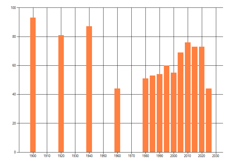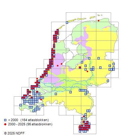 Het aantal atlasblokken (5x5 km) waarin de soort is gemeld binnen een periode van vijf jaar (vanaf 1980) of twintig jaar. Niet gecorrigeerd voor waarnemersinspanning en het aantal doorgegeven waarnemingen kan sterk variƫren per periode, dus een trend in verspreiding kan hier niet direct uit worden afgelezen. Het opgegeven jaartal is het eerste jaar van de periode. Bron: gevalideerde waarnemingen uit de NDFF.