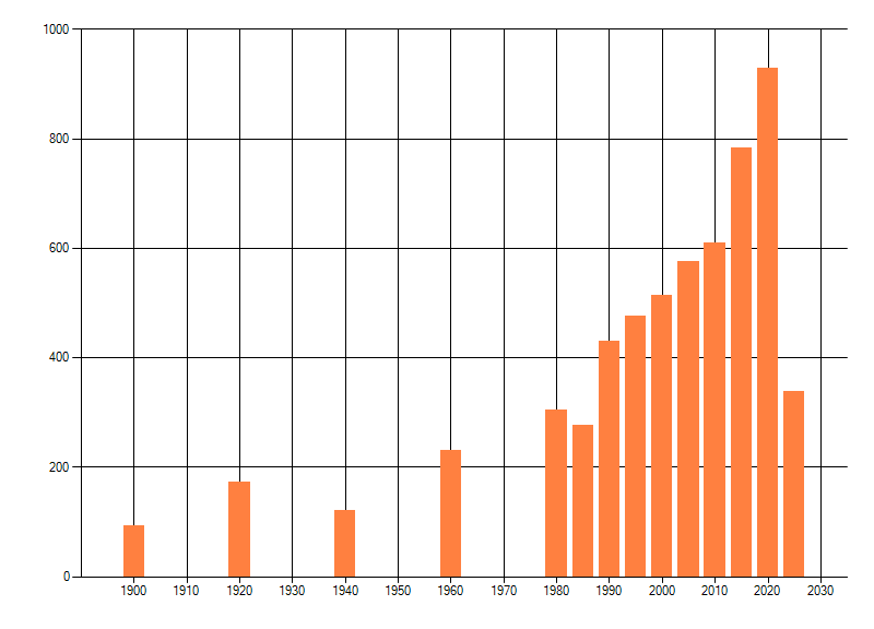 Het aantal atlasblokken (5x5 km) waarin de soort is gemeld binnen een periode van vijf jaar (vanaf 1980) of twintig jaar. Niet gecorrigeerd voor waarnemersinspanning en het aantal doorgegeven waarnemingen kan sterk variƫren per periode, dus een trend in verspreiding kan hier niet direct uit worden afgelezen. Het opgegeven jaartal is het eerste jaar van de periode. Bron: gevalideerde waarnemingen uit de NDFF.