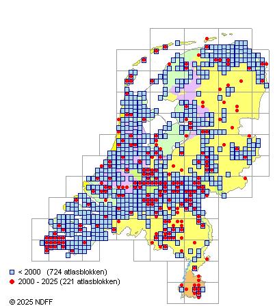 Het aantal atlasblokken (5x5 km) waarin de soort is gemeld binnen een periode van vijf jaar (vanaf 1980) of twintig jaar. Niet gecorrigeerd voor waarnemersinspanning en het aantal doorgegeven waarnemingen kan sterk variëren per periode, dus een trend in verspreiding kan hier niet direct uit worden afgelezen. Het opgegeven jaartal is het eerste jaar van de periode. Bron: gevalideerde waarnemingen uit de NDFF.
