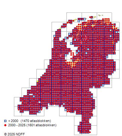Het aantal atlasblokken (5x5 km) waarin de soort is gemeld binnen een periode van vijf jaar (vanaf 1980) of twintig jaar. Niet gecorrigeerd voor waarnemersinspanning en het aantal doorgegeven waarnemingen kan sterk variëren per periode, dus een trend in verspreiding kan hier niet direct uit worden afgelezen. Het opgegeven jaartal is het eerste jaar van de periode. Bron: gevalideerde waarnemingen uit de NDFF.