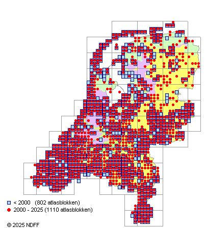 Het aantal atlasblokken (5x5 km) waarin de soort is gemeld binnen een periode van vijf jaar (vanaf 1980) of twintig jaar. Niet gecorrigeerd voor waarnemersinspanning en het aantal doorgegeven waarnemingen kan sterk variëren per periode, dus een trend in verspreiding kan hier niet direct uit worden afgelezen. Het opgegeven jaartal is het eerste jaar van de periode. Bron: gevalideerde waarnemingen uit de NDFF.