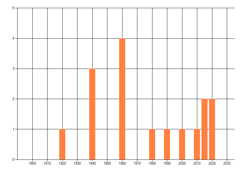 Het aantal atlasblokken (5x5 km) waarin de soort is gemeld binnen een periode van vijf jaar (vanaf 1980) of twintig jaar. Niet gecorrigeerd voor waarnemersinspanning en het aantal doorgegeven waarnemingen kan sterk variëren per periode, dus een trend in verspreiding kan hier niet direct uit worden afgelezen. Het opgegeven jaartal is het eerste jaar van de periode. Bron: gevalideerde waarnemingen uit de NDFF.