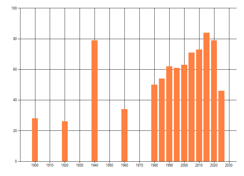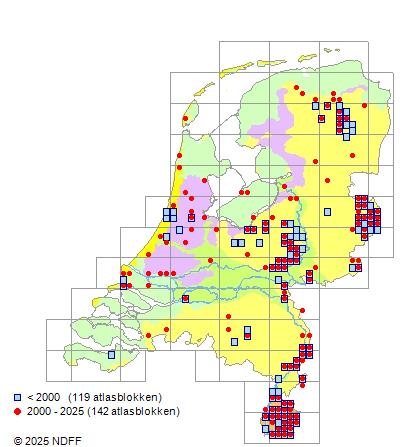 Het aantal atlasblokken (5x5 km) waarin de soort is gemeld binnen een periode van vijf jaar (vanaf 1980) of twintig jaar. Niet gecorrigeerd voor waarnemersinspanning en het aantal doorgegeven waarnemingen kan sterk variëren per periode, dus een trend in verspreiding kan hier niet direct uit worden afgelezen. Het opgegeven jaartal is het eerste jaar van de periode. Bron: gevalideerde waarnemingen uit de NDFF.