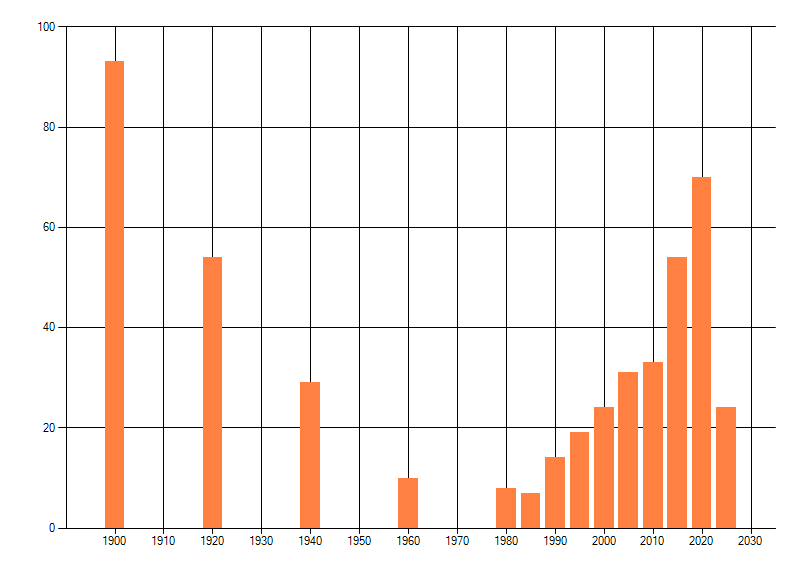 Het aantal atlasblokken (5x5 km) waarin de soort is gemeld binnen een periode van vijf jaar (vanaf 1980) of twintig jaar. Niet gecorrigeerd voor waarnemersinspanning en het aantal doorgegeven waarnemingen kan sterk variƫren per periode, dus een trend in verspreiding kan hier niet direct uit worden afgelezen. Het opgegeven jaartal is het eerste jaar van de periode. Bron: gevalideerde waarnemingen uit de NDFF.