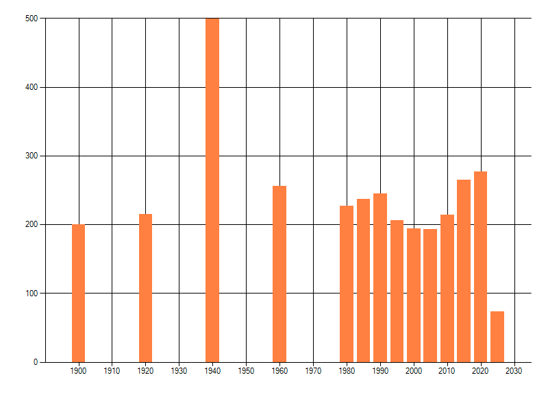 Het aantal atlasblokken (5x5 km) waarin de soort is gemeld binnen een periode van vijf jaar (vanaf 1980) of twintig jaar. Niet gecorrigeerd voor waarnemersinspanning en het aantal doorgegeven waarnemingen kan sterk variëren per periode, dus een trend in verspreiding kan hier niet direct uit worden afgelezen. Het opgegeven jaartal is het eerste jaar van de periode. Bron: gevalideerde waarnemingen uit de NDFF.