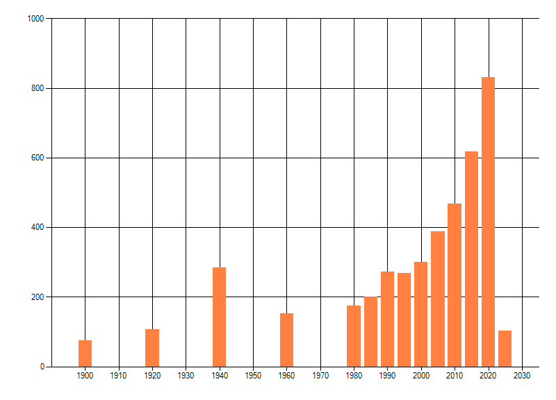 Het aantal atlasblokken (5x5 km) waarin de soort is gemeld binnen een periode van vijf jaar (vanaf 1980) of twintig jaar. Niet gecorrigeerd voor waarnemersinspanning en het aantal doorgegeven waarnemingen kan sterk variƫren per periode, dus een trend in verspreiding kan hier niet direct uit worden afgelezen. Het opgegeven jaartal is het eerste jaar van de periode. Bron: gevalideerde waarnemingen uit de NDFF.